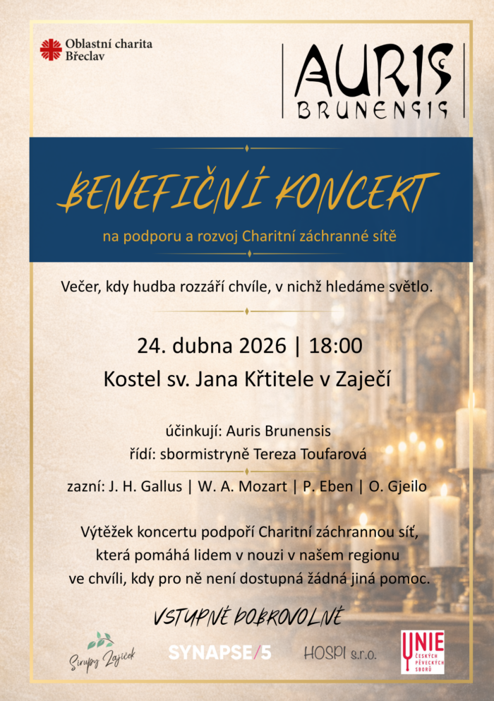 tentokrát zazpíváme v Zaječí na podporu a rozvoj Charitní záchranné sítě. Spolupořadatelem je Oblastní charita Břeclav a jako vždy Sirupy Zajíček.